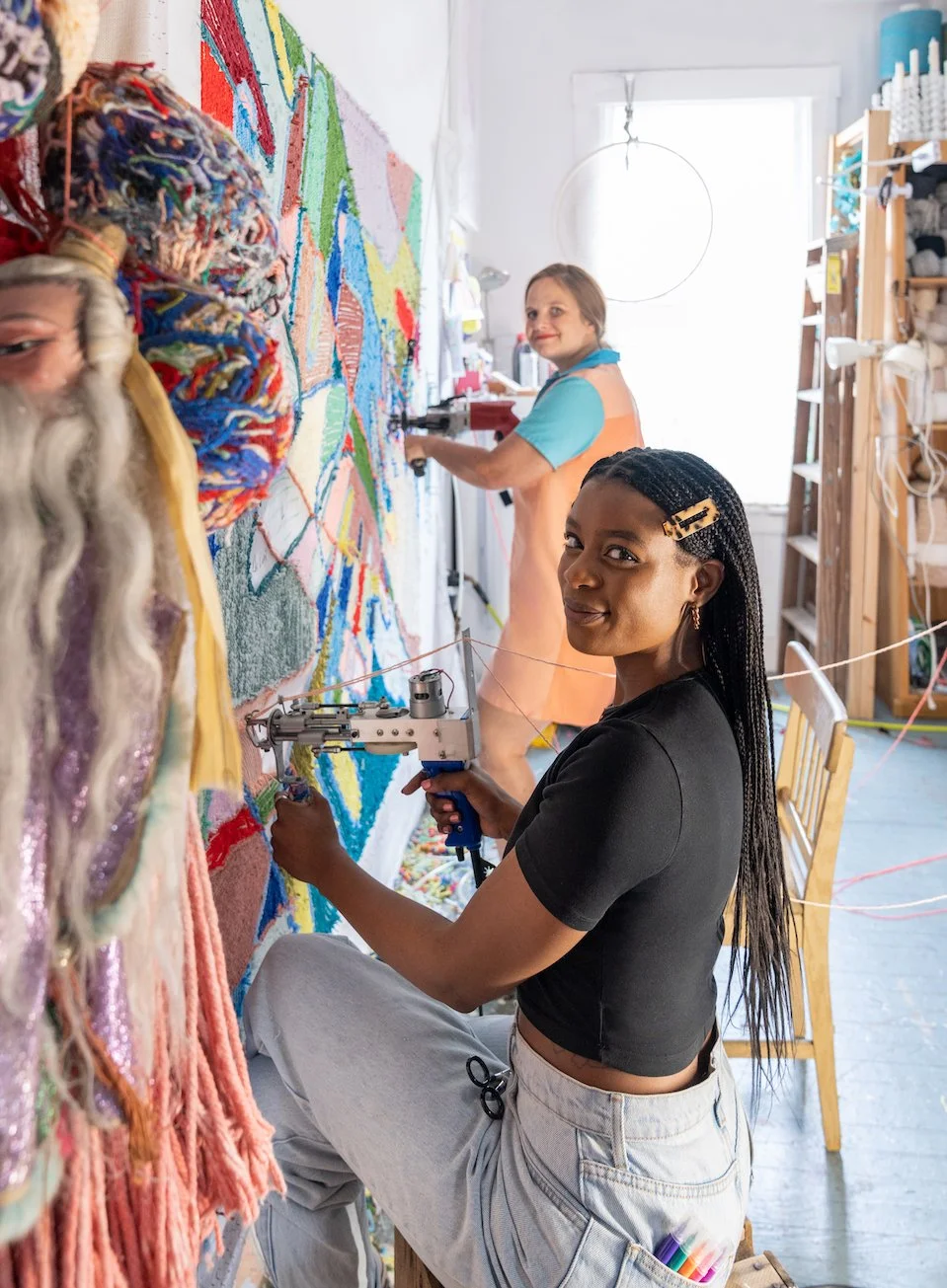 Meals on Wheels Atlanta and Paula Wallace tapped 14 notable SCAD Alumni in the Spring of 2022 to commission and curate a collection of more than 50 works of art for their new headquarters. Aliyah Salmon and Trish Andersen collaborated to create a bespoke 6ft tufted mural for their space. Working with Andersen over the course of a week, the artists created a tactile and meaningful representation of the “giving hands” and care the organization provides for the community.